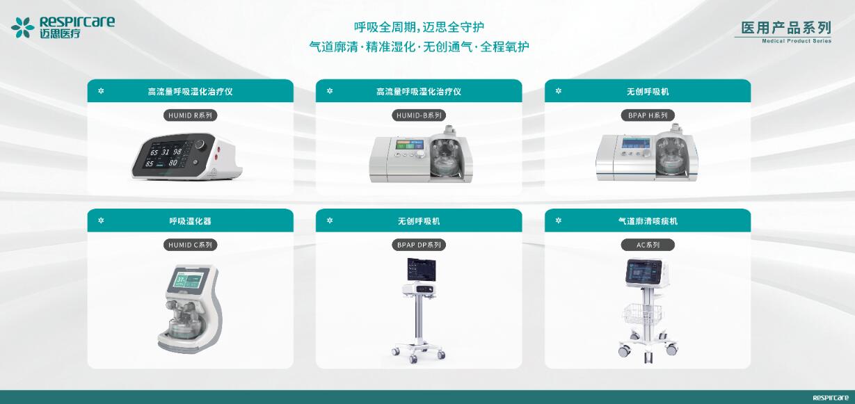 包括气道廓清设备、高流量呼吸湿化治疗仪、呼吸湿化器、无创呼吸机及加热呼吸管路等产品,覆盖临床呼吸支持与气道管理需求。